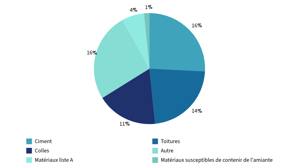 Les matériaux de la liste A (flocages, calorifugeages, faux plafonds) représentent environ 4 % des matériaux déclarés dans les données analysées.