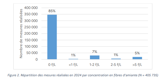 La majorité des résultats se situe à des niveaux faibles (85 % à 0 f/L), tandis que 5 % des mesures dépassent le seuil de 5 f/L, principalement dans des contextes de travaux.